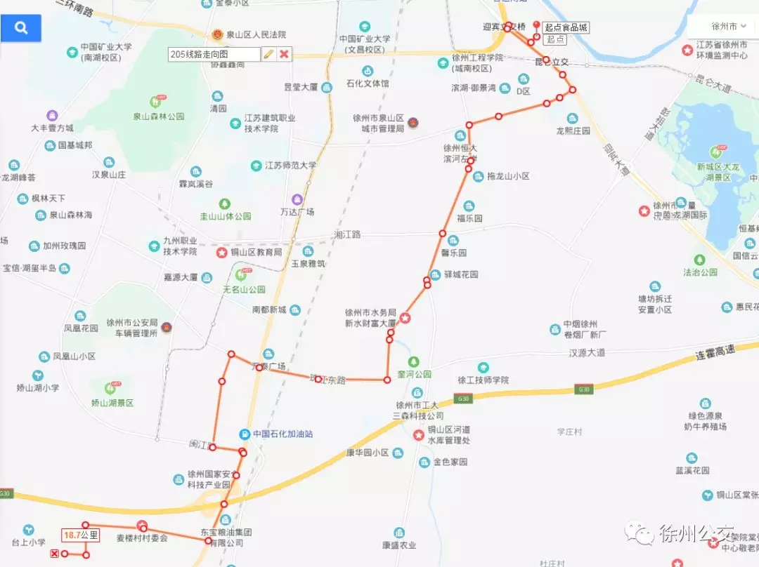 為滿足廣大市民出行需求,進一步擴大徐州高新區(qū)和市區(qū)的交通線網(wǎng),促進區(qū)域交通和諧發(fā)展,為更多的市民提供便捷的城市客運服務(wù),徐州公交開通了205路線,并于12月18日上午8:30分開始試運行具體線路走向及??空军c如下: