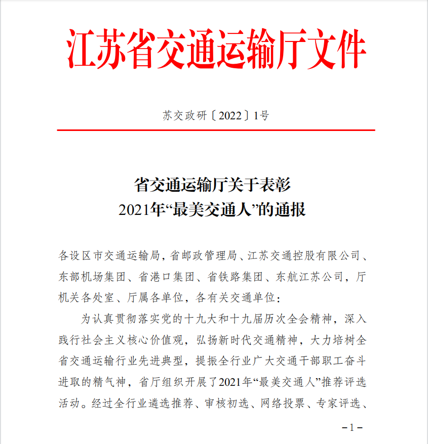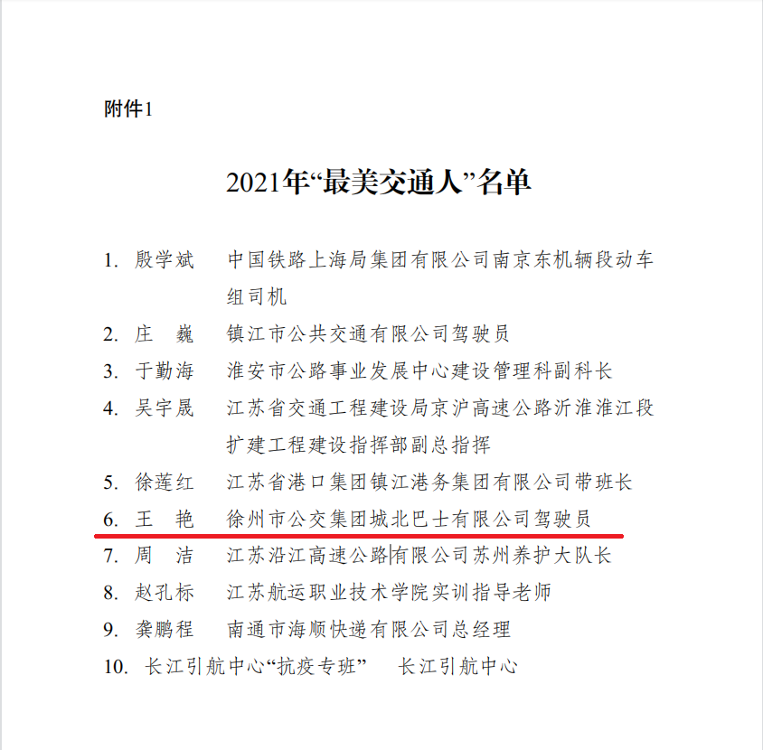 近日,江蘇省交通運(yùn)輸廳下發(fā)《省交通運(yùn)輸廳關(guān)于表彰2021年“最美交通人”的通報(bào)》,徐州公交集團(tuán)公交車駕駛員王艷榮獲“最美交通人”稱號。