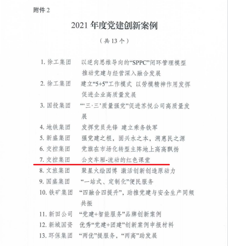 同時(shí),市國資委黨委通報(bào)了2021 年度十佳黨建品牌和優(yōu)秀"黨建+"創(chuàng)新案例評選表彰結(jié)果,徐州公交《公交車廂-流動(dòng)的紅色課堂》獲評2021年度黨建創(chuàng)新案例。