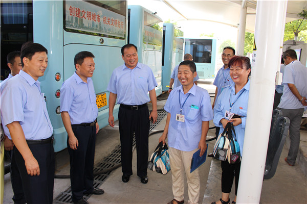 炎炎烈日下,空調(diào)公交車成為市民出行首選。為給市民營造舒適、涼爽的乘車環(huán)境,各運營公司應(yīng)用公交GPS智能調(diào)度系統(tǒng),科學調(diào)度、靈活排班、保證運力充足。同時,結(jié)合創(chuàng)建工作,提高服務(wù)質(zhì)量,全市2100多輛空調(diào)車全部開足冷氣;駕乘人員揮汗如雨堅持“一趟一清掃”,認真做好車輛清潔工作;督導隊員冒著高溫在各大站臺維持秩序、扶老攜幼、做好導乘服務(wù)、嚴查易燃易爆及危險品。由于各項舉措落實到位,確保了高溫期間全市161條公交線路運營順暢,乘客走好走了。(圖為董事長、總經(jīng)理杜紅軍,總經(jīng)理助理李修超一行在食品城充電站慰問堅守崗位的充電員工。)